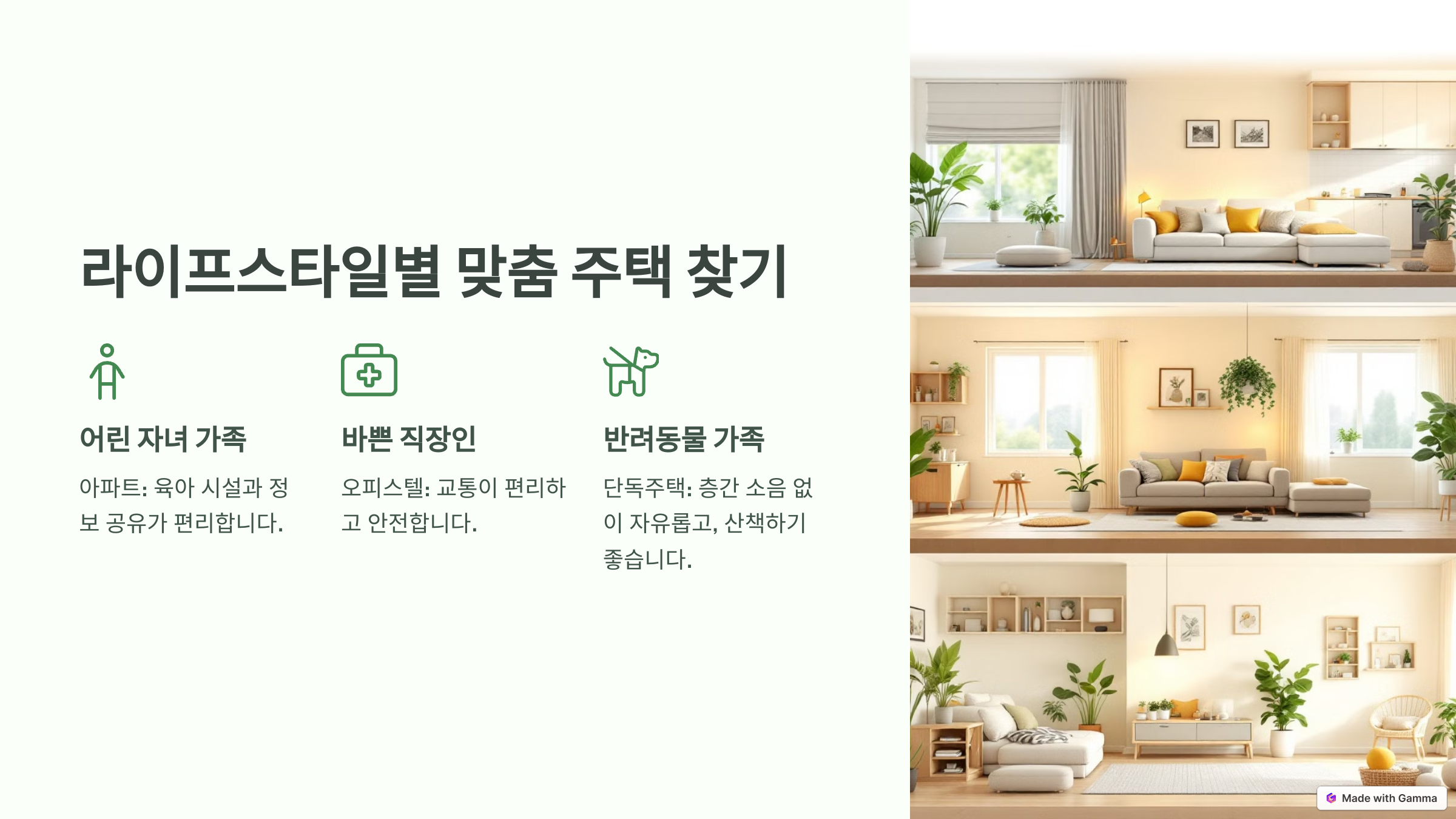 | 👶 어린 자녀가 있는 가족 | 아파트 | 놀이터, 키즈카페, 육아커뮤니티 등 자녀 양육에 편리한 시설 갖춤 |